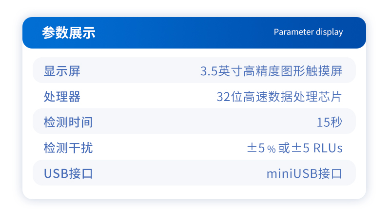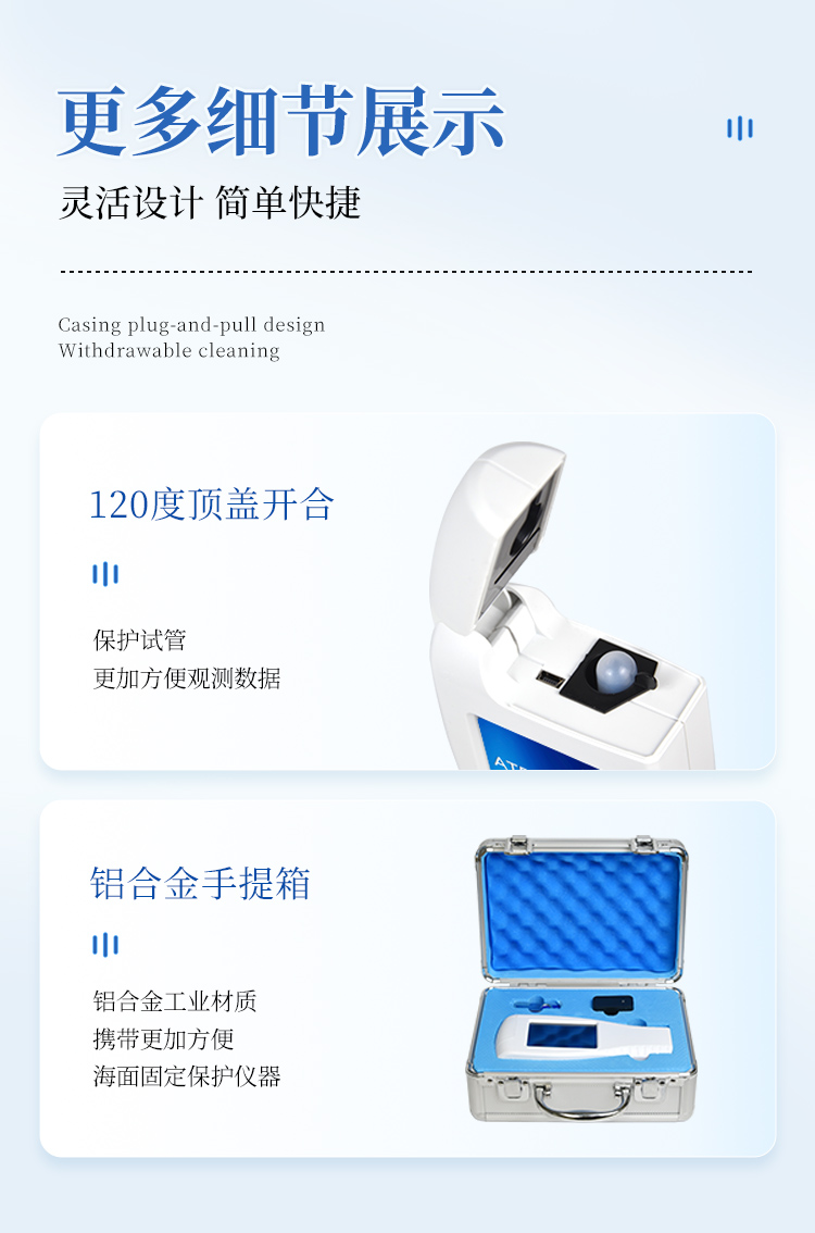 該設備采用生物化學反應方法檢測ATP含量,細菌檢測儀基于螢火蟲發光原理,利用“熒光素酶—熒光素體系”快速檢測三磷酸腺苷(ATP)。ATP拭子含有可以裂解細胞膜的試劑,能將細胞內ATP釋放出來,與試劑中含有的特異性酶發生反應,產生光,再用熒光照度計檢測發光值,微生物的數量與發光值成正比,由于所有生物活細胞中含有恒量的ATP,所以ATP含量可以清晰地表明樣品中微生物與其他生物殘余的多少,用于判斷衛生狀況。