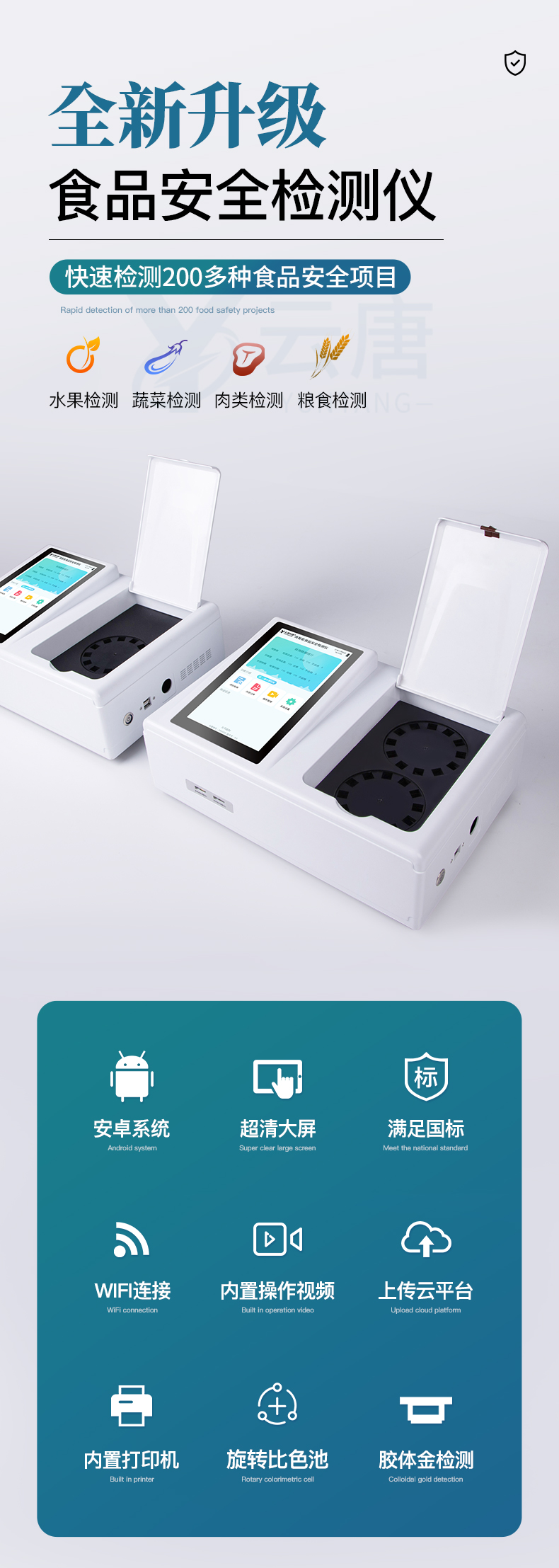1、儀器采用臺式一體化系統(tǒng)檢測技術(shù),將分光光度模塊、數(shù)字化管理模塊、無線通訊模塊高度集成于一體,支持檢測200種食品安全檢測項目,同時預(yù)留升級檢測方法。