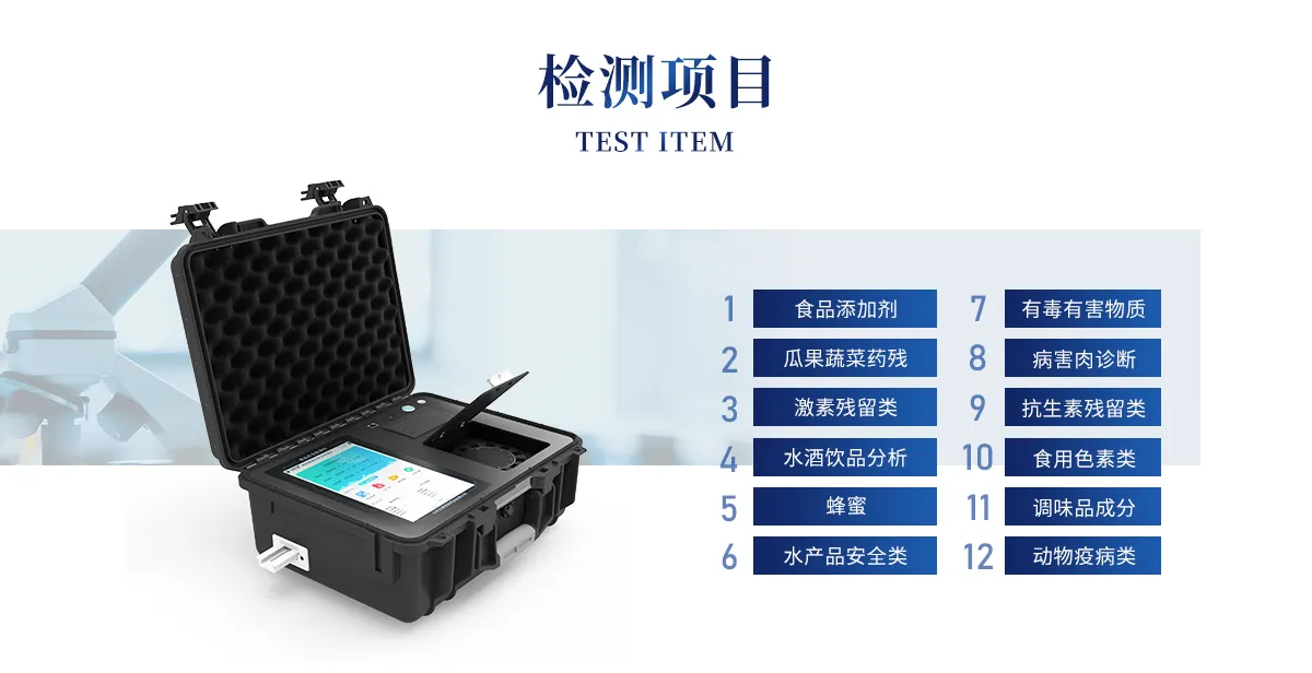 山東藍虹光電科技有限公司生產的高智能食品安全檢測儀可快速檢測200多種食品安全項目,包含非食用化學物質、濫用食品添加劑、農藥殘留、獸藥殘留、重金屬、病害肉、營養強化劑、抗生素類殘留、激素類殘留、真菌毒素類殘留、化學類殘留等項目的定性定量檢測。