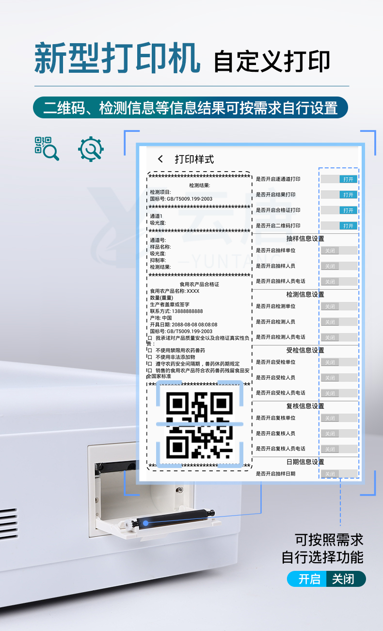 9.7.1、全新打印系統:內置全新打印機,新創自定義打印方式,可按需靈活勾選控制:產品合格證(國家農業部標準要求),二維碼,抽樣信息、檢測信息,受檢信息、復核信息、抽樣日期、檢測日期等信息的打印。