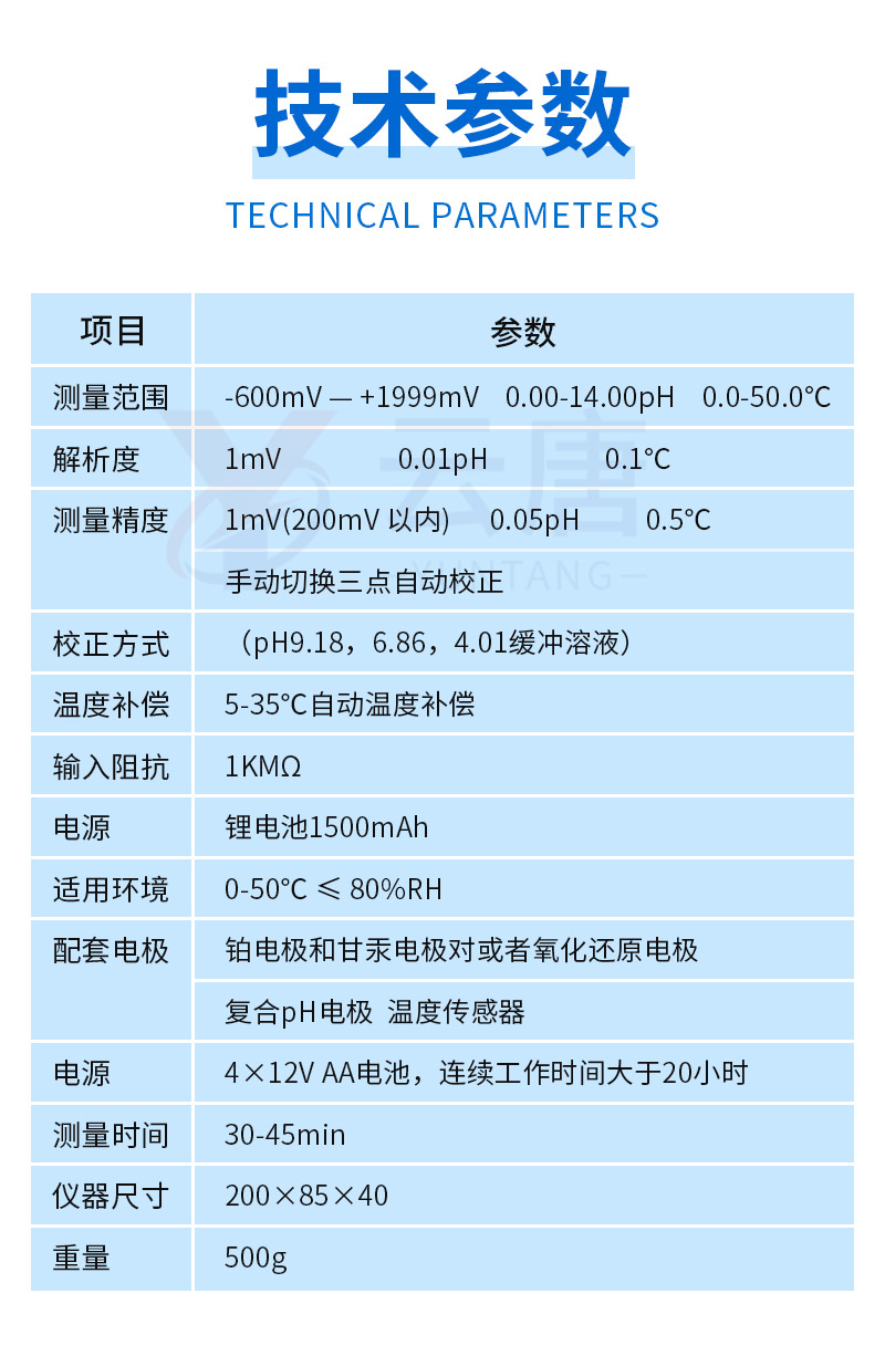測量精度:1mV(200mV 以內) 0.05pH 0.5℃